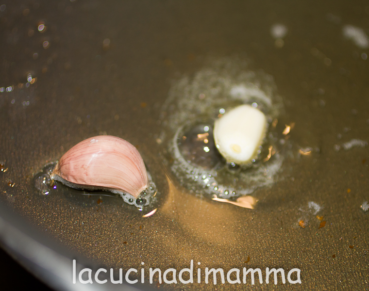 Preparare il condimento, versare in una padella l’olio, unire l’aglio e far soffriggere.