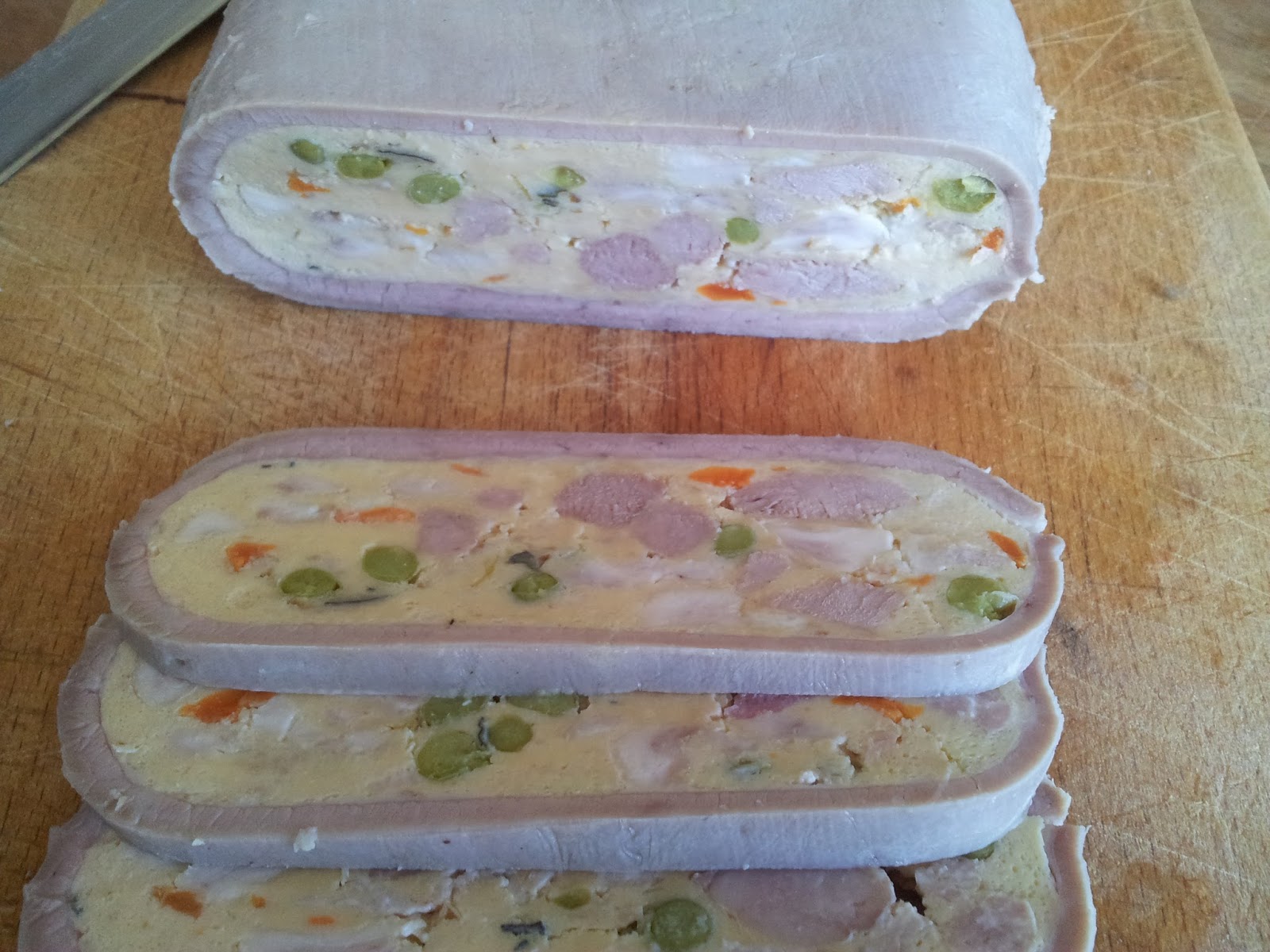 frattaglie, verdure e uova, lessata poi in brodo, raffreddata sotto un peso,