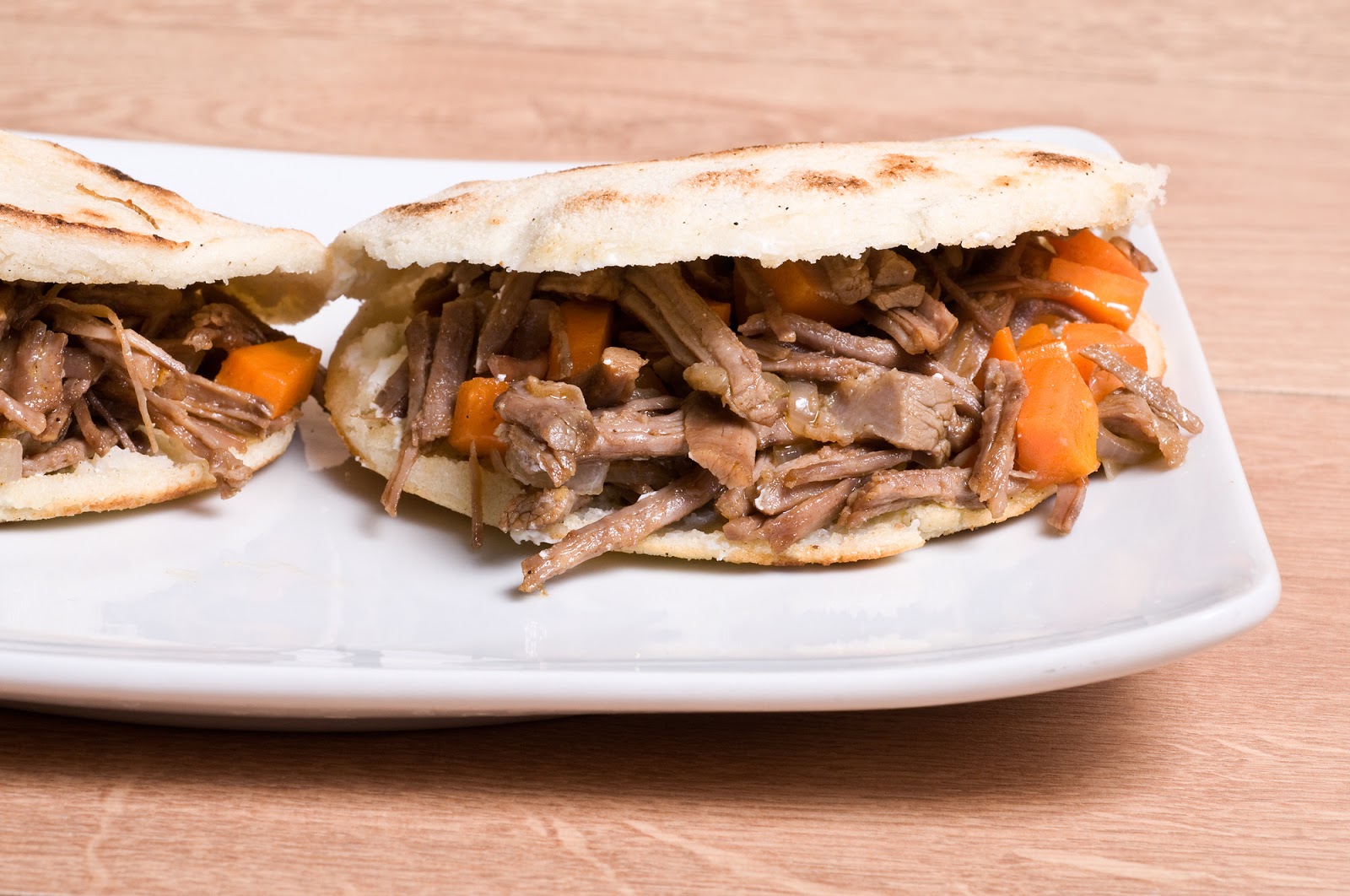 Quando la carne a sfilacci si sarà insaporita, spegnete e farcitene le vostre arepas. Se preferite, prima della carne, potete insaporire i dischi spalmandone le pareti con un po’ di burro o robiola.